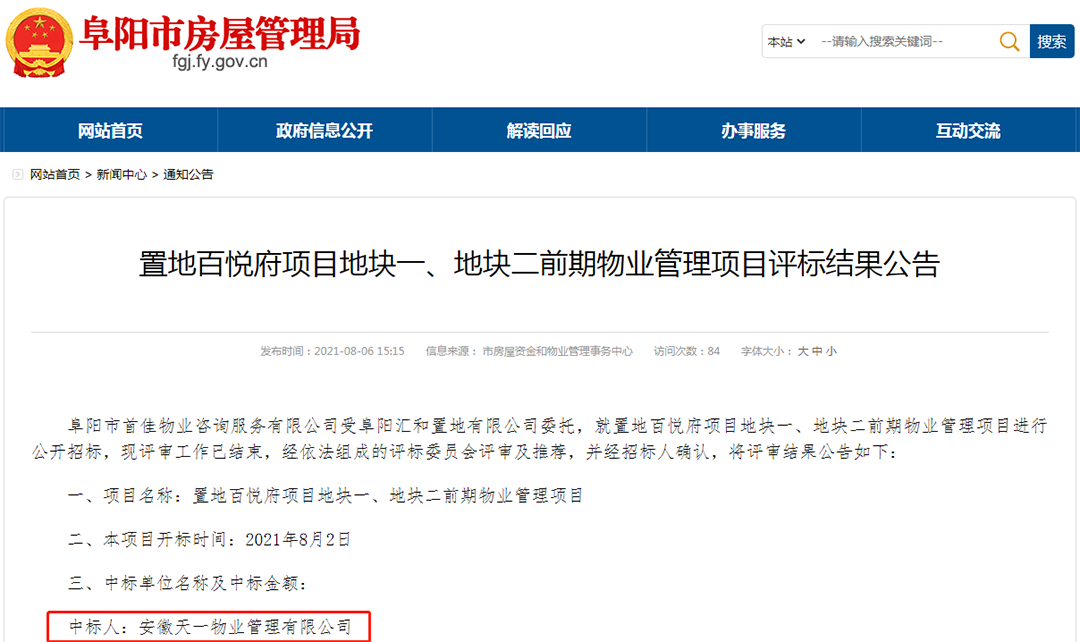自招标公告发布后,新华天一服务高度重视,积极开展费用测算、标书制作、现场勘探等前期工作,最终在激烈的投标竞争中以优异的成绩中标阜阳市置地百悦府地块一地块二前期物业管理权。