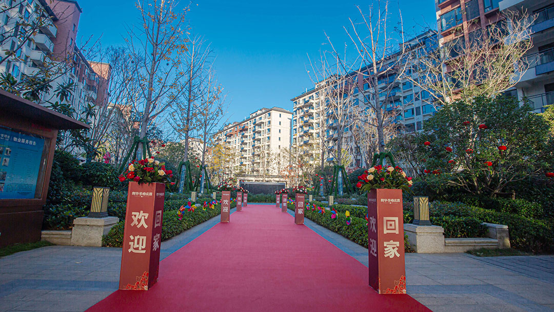 来到交付现场,大门处放置着各种装饰品,充满了交房的喜悦。缓缓走入门中,路面铺设红色地毯,两边放置花篮,隆重且仪式感满满。
