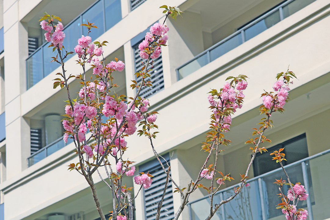 虽然只有七栋洋房交付,但景观一点儿都没含糊。乔木很多、密度很大,而且景观的层次多,颜色多,置身其中,很难相信这是一个刚刚交付的社区。项目约32.55%的绿地率,约60米超大楼间距,两条竖向主景观轴线与中央景观交替,通过各种小品搭配,使景观与业主活动空间相融合,营造出一个既有传统审美意趣,又有现代审美的园林景观。园区内一步一景,步步有景。入口处的景观树对阵式排列,好像仪仗兵列队欢迎您归家,彰显尊贵感,道路两旁种植紫叶李、樱花、海棠、枫树、桂花、朴树、香泡等乔木,搭配色彩淡雅的南天竹、金边黄杨、杜鹃等植物,每一寸美的背后,都纳藏着“不计成本”的匠心。