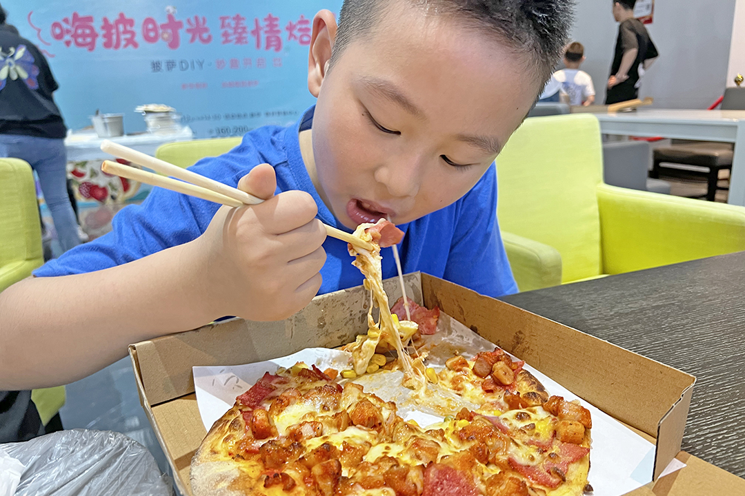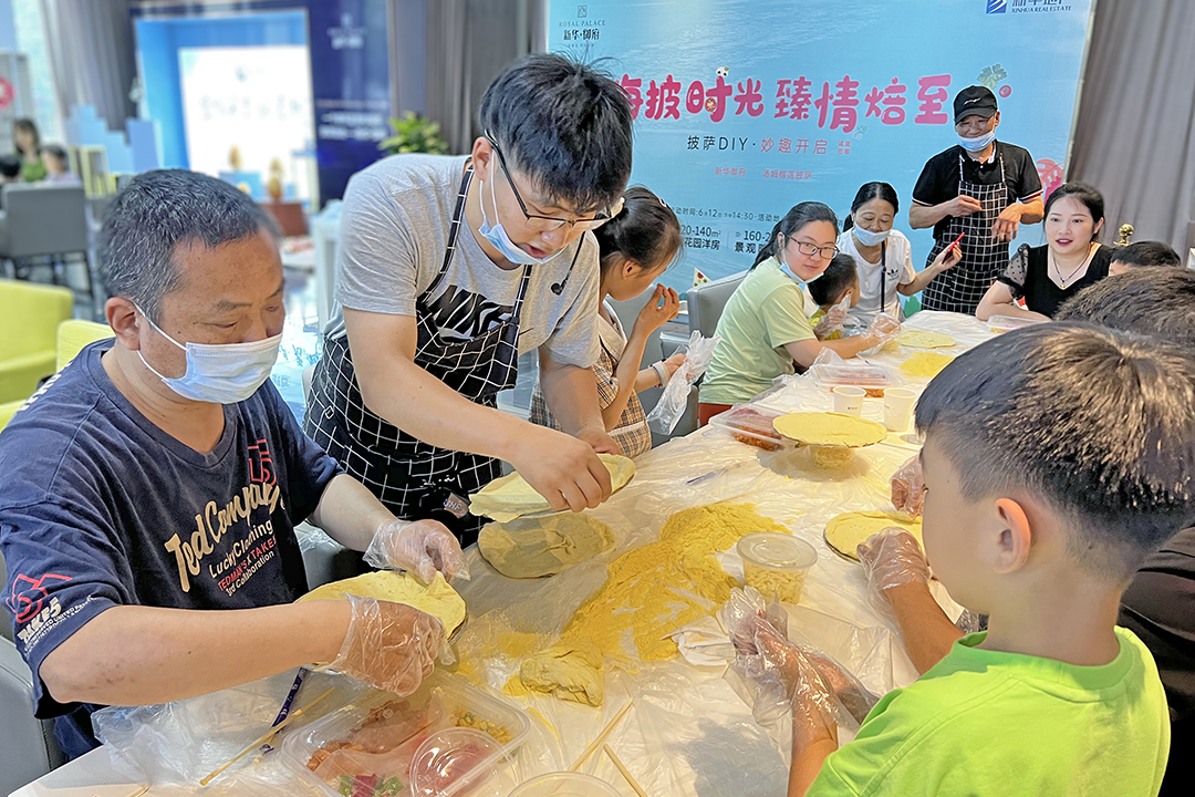 烤好的披萨被切开,大家趁热咬一口,融化的芝士被拉出长长的丝。 大家一边吃着自己亲自烘焙而出的香酥披萨,一边喝着新华天一服务客服小姐姐送来的清爽的水果茶饮品,脸上满满的幸福和快乐、惬意的生活情调充盈了整个周末的时光。
