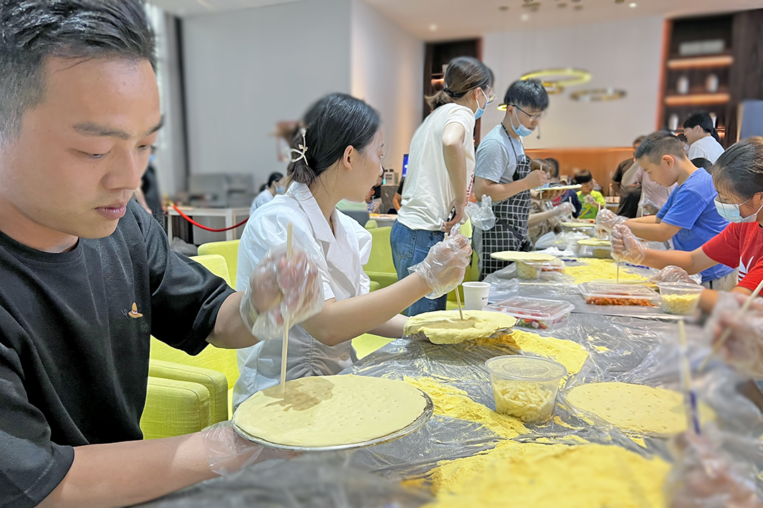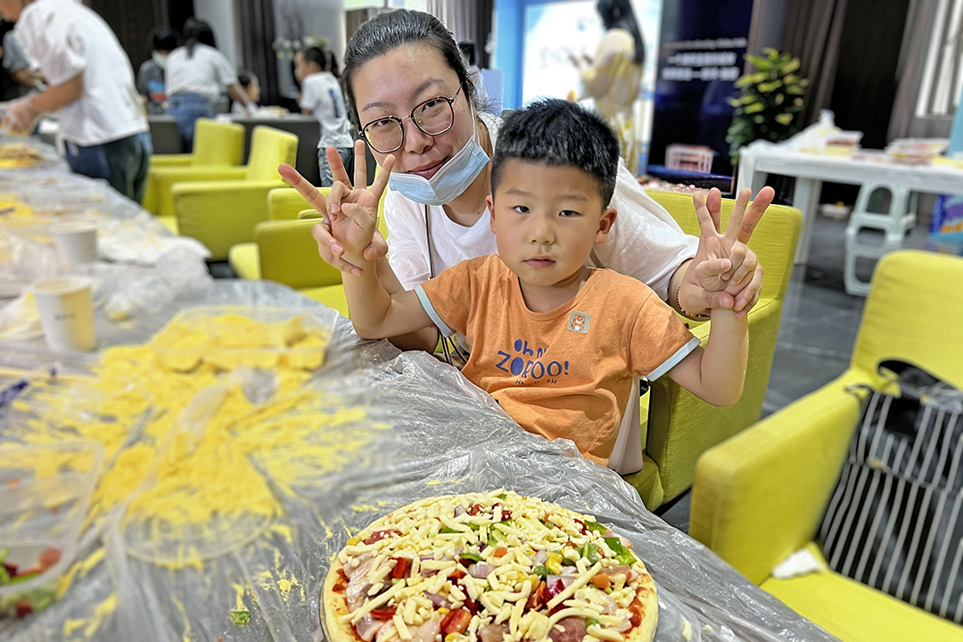 大家用细腻的玉米粉揉着面团,按照老师教的技巧做好Q弹的面饼平铺在烤盘上,加入馅料有芝士、培根、玉米粒,加上红辣椒、青辣椒、洋葱等佐料,完成这些工序之后,制作老师帮忙把披萨放进烤箱里。在烤制了5多分钟后,芝士的香味渐渐地飘散出来……金黄的披萨点缀着各种颜色的蔬菜、水果,刺激着大家的眼球和味蕾。